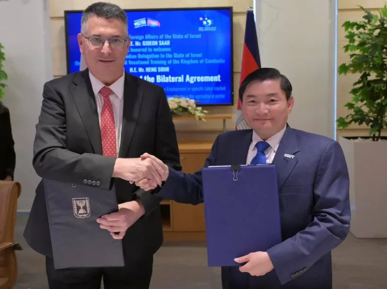 שר החוץ גדעון סער חתם היום (יום שני, 1 בדצמבר 2025) על הסכם מסגרת דו-צדדי והסכם יישום עם שר העבודה וההכשרה המקצועית של קמבודיה, מר Heng Sour, להעסקת אלפי עובדים קמבודיים בישראל בתחום החקלאות.