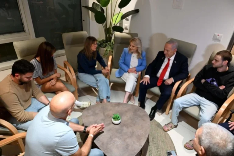 ראש הממשלה בנימין נתניהו ואשתו שרה, אמש, הגיעו לבית החולים בילינסון ונפגשו עם החטופים ששבו: אבינתן אור, אלון אוהל, גיא גלבוע-דלאל, אביתר דוד ואיתן מור.
